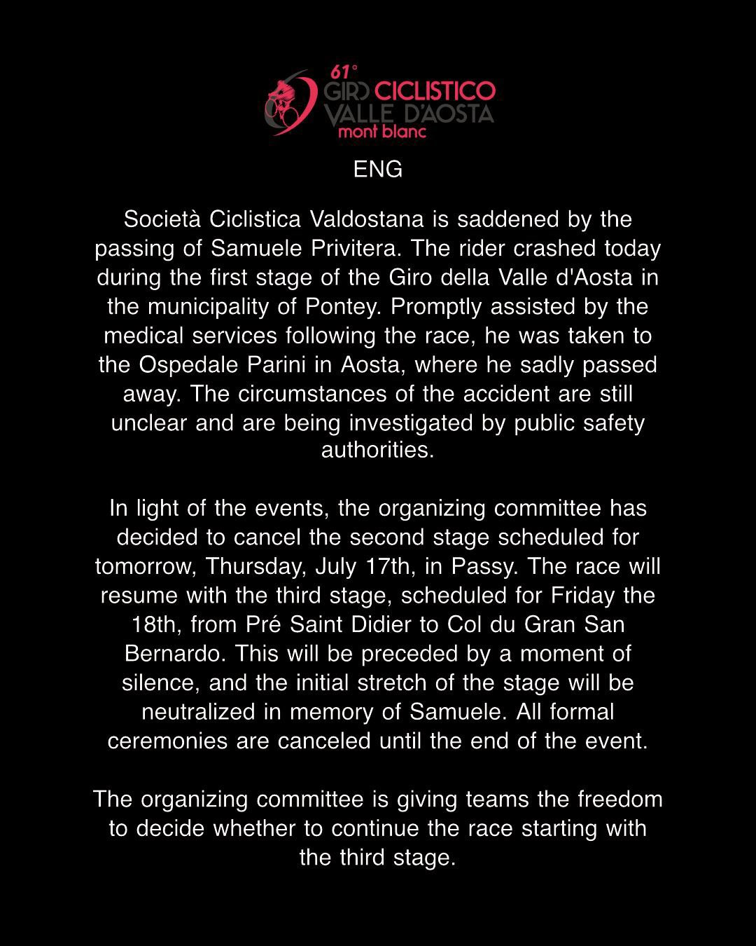 We are deeply saddened by the tragic death of Samuele Privitera, 19 years old, while racing Giro Valle d’Aosta.